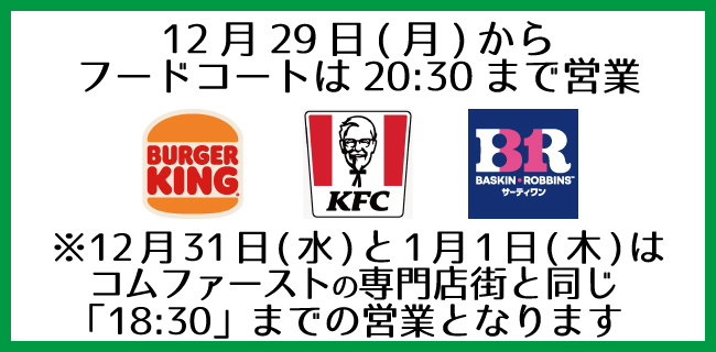 12月29日より営業終了時間を20:30といたします ◆ケンタッキー・フライド・チキン ◆サーティーワンアイスクリーム ◆バーガーキング ※12月31日と1月1 […]